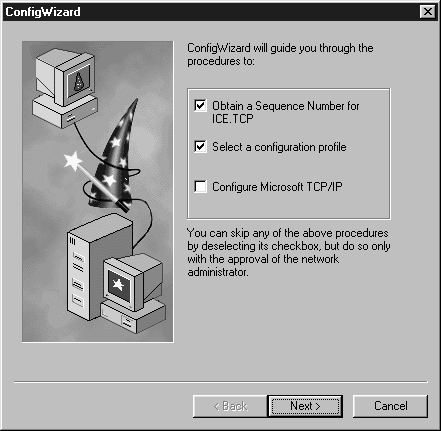 automatically runs the configuration program ConfigWizard. Step 2: Configure ICE.TCP Pro Using ConfigWizard ConfigWizard is used to obtain a sequence number, select a default